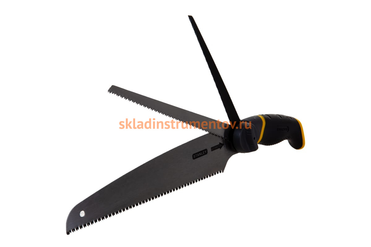 Универсальная ножовка 3 в 1 STANLEY 0-20-092 укомплектована тремя сменными полотнами. Лезвия оснащены прочными острозаточенными зубьями, которые обеспечивают чистый распил при движении "на себя". Ножовка имеет особую конструкцию с поворотным фиксатором. Благодаря его наличию можно легко менять полотна в зависимости от распиливаемого материала, а также регулировать углы наклона рукоятки.