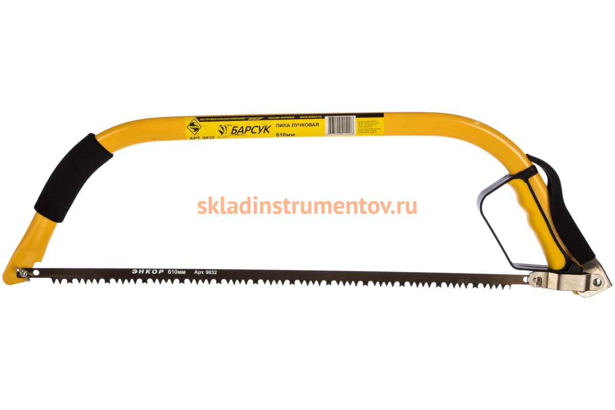 Лучковая пила 610 мм Энкор Барсук 9832 применяется для подрезки деревьев в саду и кровельных работ. Полотно надежно зафиксировано, что гарантирует безопасность. Рукоятка с ограждением для пальцев предохраняет руки оператора от проскальзывания во время работы. Пила имеет размер 610 мм.