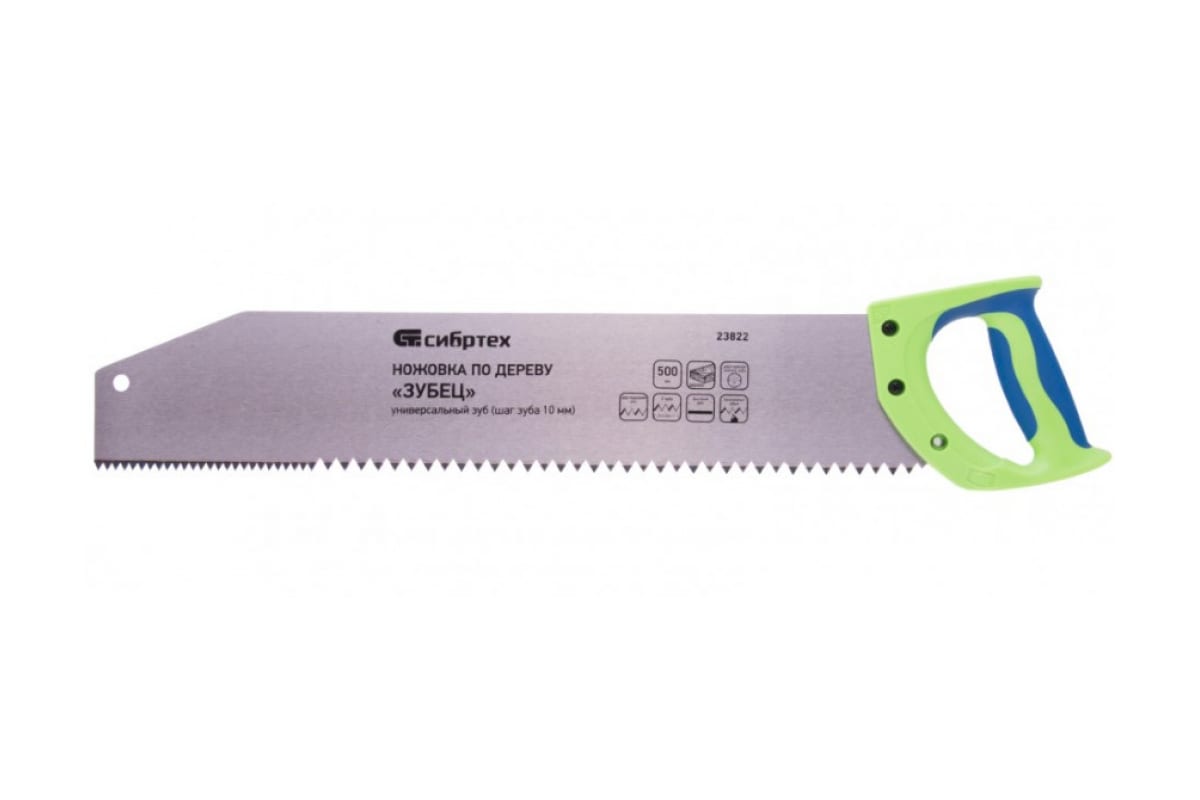 Ножовка по дереву, 500 мм, шаг зуба 10 мм, зуб 2D, калёный зуб, 2-х компонентная рукоятка СИБРТЕХ "Зубец" 23822 подойдет для быстрого распиливания деревянных заготовок.