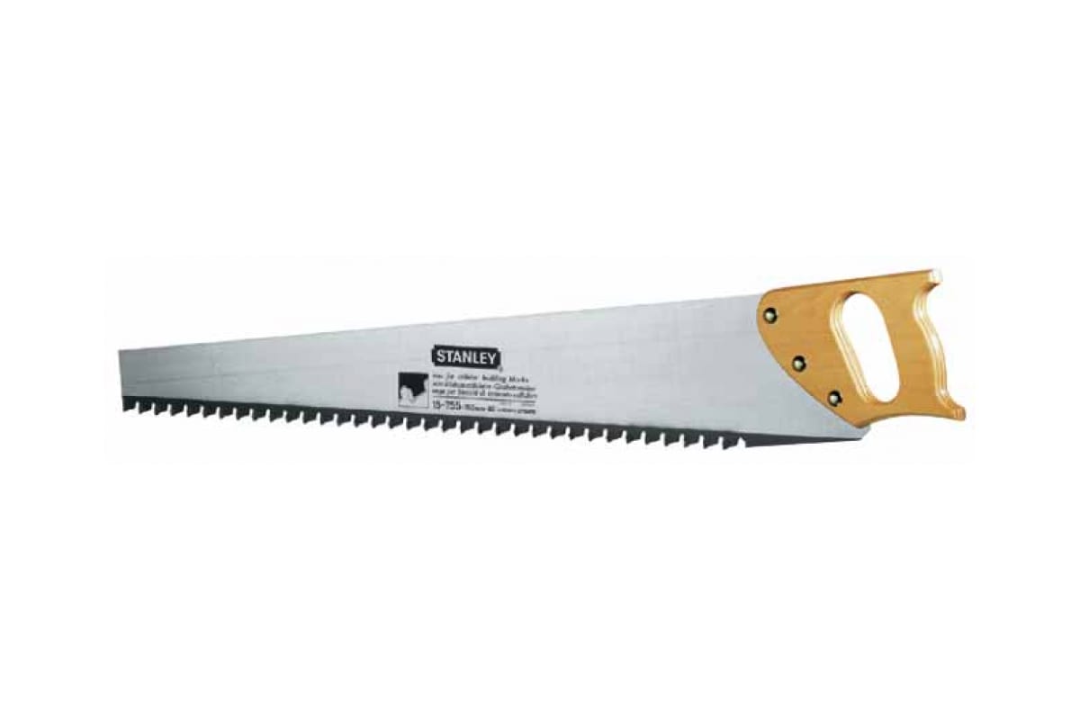 Ножовка по бетону Stanley 1-15-755 оснащена прочным стальным полотном, зубья которого имеют твердосплавные напайки из карбида вольфрама. Данный инструмент подходит как для продольного, так и для поперечного распиливания пенобетона. Ножовка оснащена удобной деревянной рукояткой с прочными креплениями к полотну, что обеспечивает прочность конструкции.