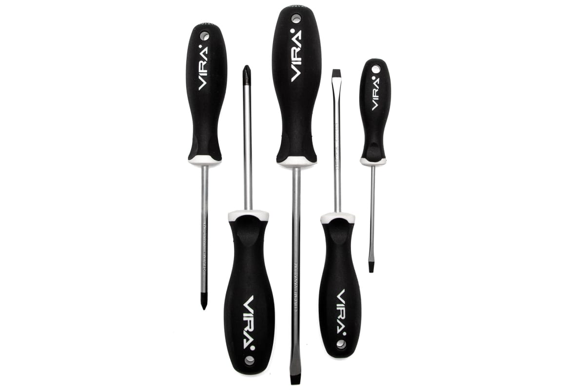 Набор отверток с эргономичной двухкомпонентной ручкой 5шт VIRA RAGE 391110 - комплект ручных инструментов для откручивания и закручивания винтов с распространенными внутренними профилями и размерами. Изделия удобны в обхвате, не проскальзывают в ладони и передают высокий крутящий момент. Прочные хромованадиевые стержни по степени твердости соответствуют 48-52 HRC. Наконечники отверток имеют точную геометрию и обладают магнитными свойствами, что снижает риск утери крепежа.