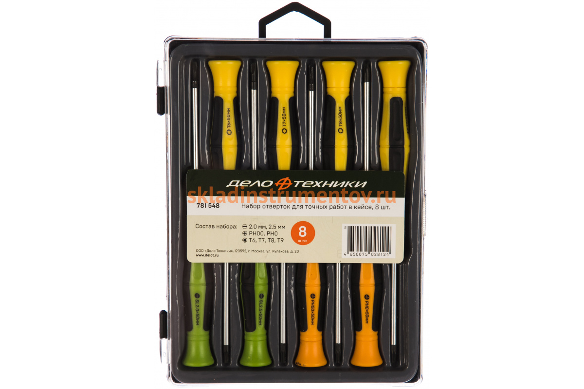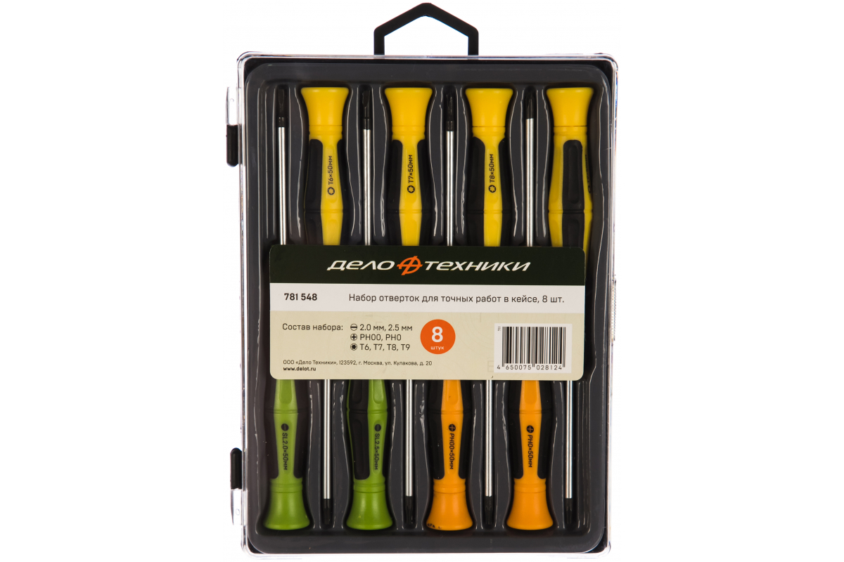 Набор отверток для точных работ в кейсе 8 штук Дело Техники 781548 подходит для электронщиков. Длинная рукоять и точная обработка наконечников стержней значительно упрощает работу.