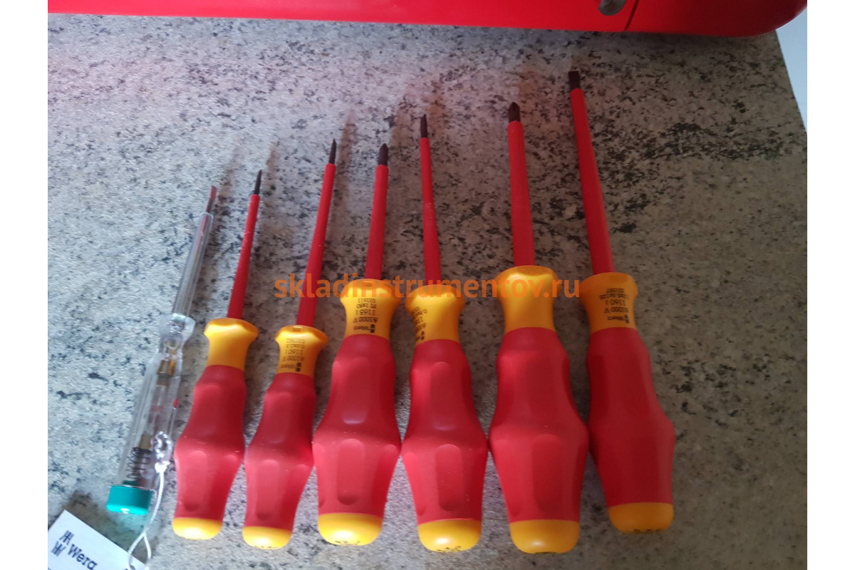 Набор диэлектрических отверток 1160i/1165i/7 SATZ 6TLG / 6 PCS WERA WE-031576 применяется для винтов со шлицем и крестовым шлицем Phillips-Recess. Такой набор предназначен для работ под напряжением до 1000В. Стержни инструментов изготовлены из высококачественного материала, что значительно увеличивает срок службы изделий и оберегает их от поломок.