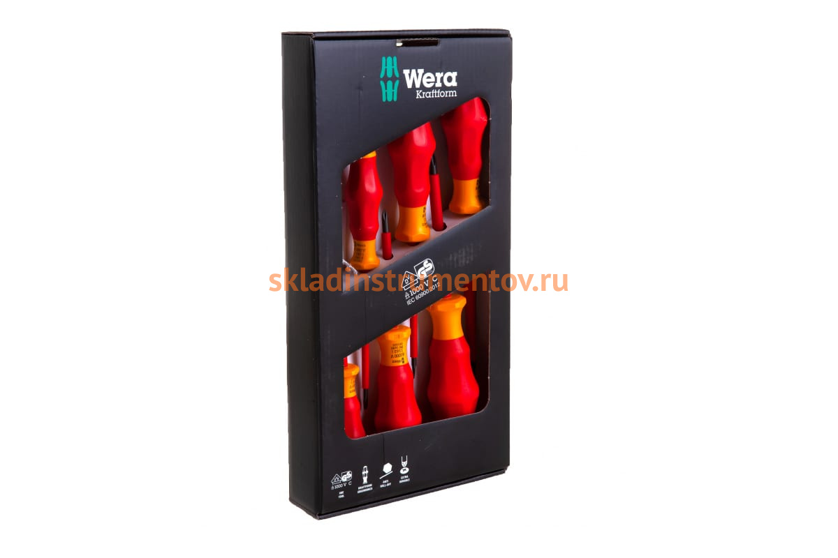 Набор диэлектрических отверток 1160i/7 SATZ 6TLG / 6 PCS WERA WE-031575 находит свое применение в электротехнической сфере - для закручивания/откручивания винтов со шлицем и крестовым шлицем Phillips-Recess. Такой набор - прекрасное решение для работы с деталями под напряжением. Стержни отверток, входящих в набор, имеют диэлектрическое покрытие.
