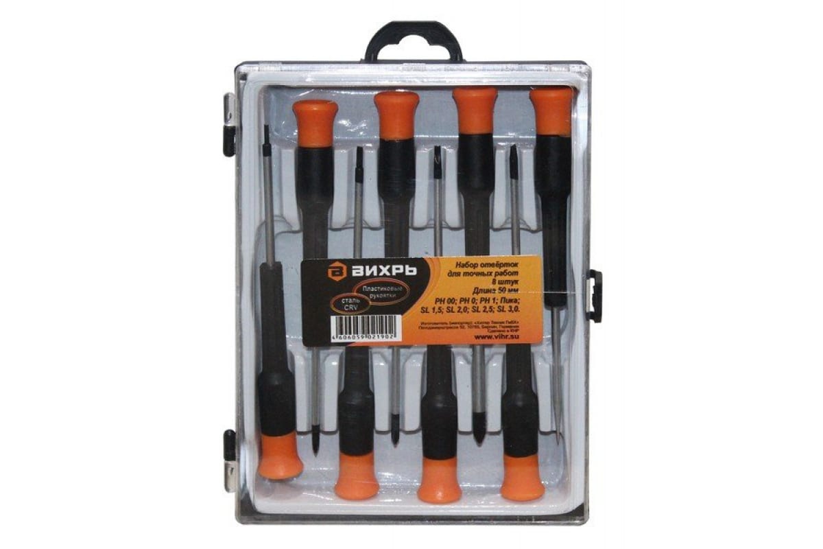 Набор отвёрток для точных работ Вихрь НОТ 8 73/6/2/12 поможет справиться с крепежом небольшого размера. Инструмент имеет тонкую длинную рукоятку и короткое жесткое жало.