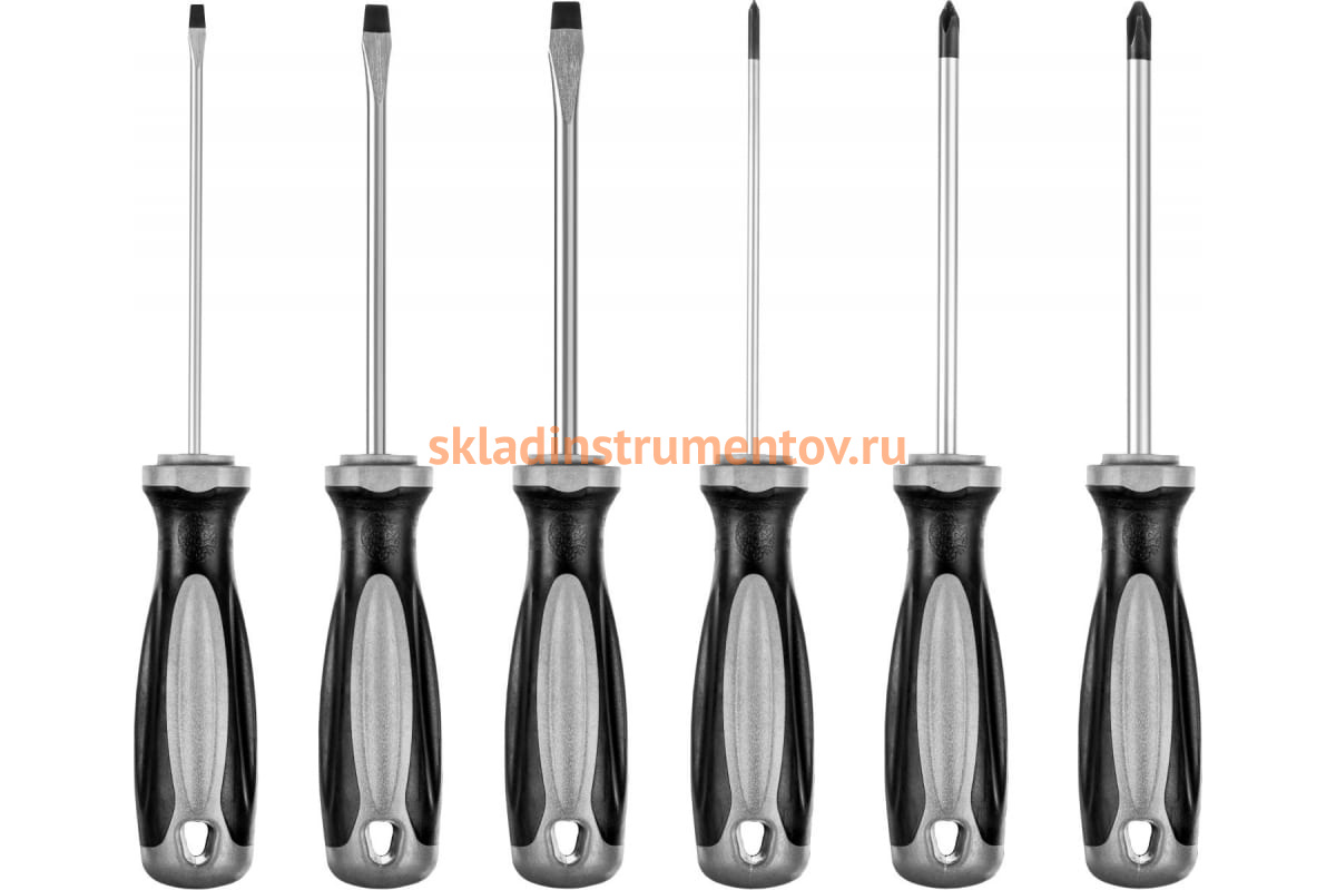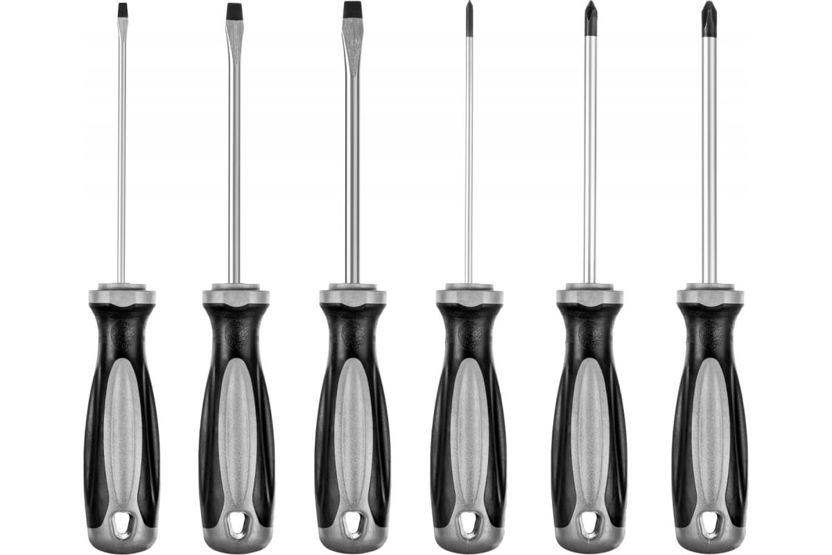 Набор отверток MIRAX 6 предметов 25186 имеет в комплекте три отвертки с прямым шлицем и три отвертки с крестовым. Инструменты позволяют закручивать и откручивать крепежные элементы. Стальной стержень устойчив к износу, поэтому имеет долгий срок службы.