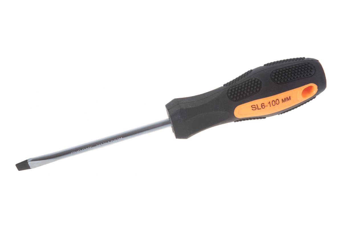 Шлицевая отвёртка SL6, 100 мм Вихрь 73/6/2/9 обладает широким шлицем, которого достаточно для работы с большими винтами. Преимущество модели заключается в наличии нескользящей двухкомпонентной рукоятки.