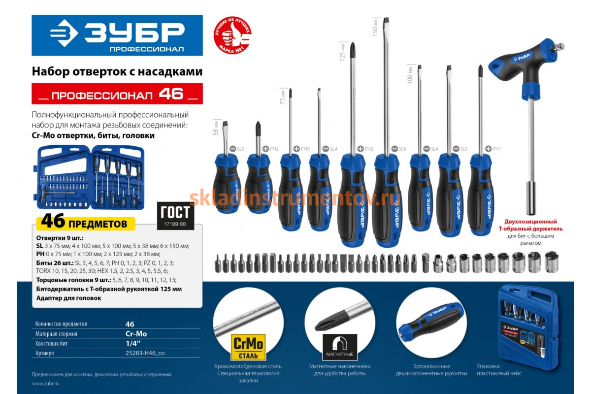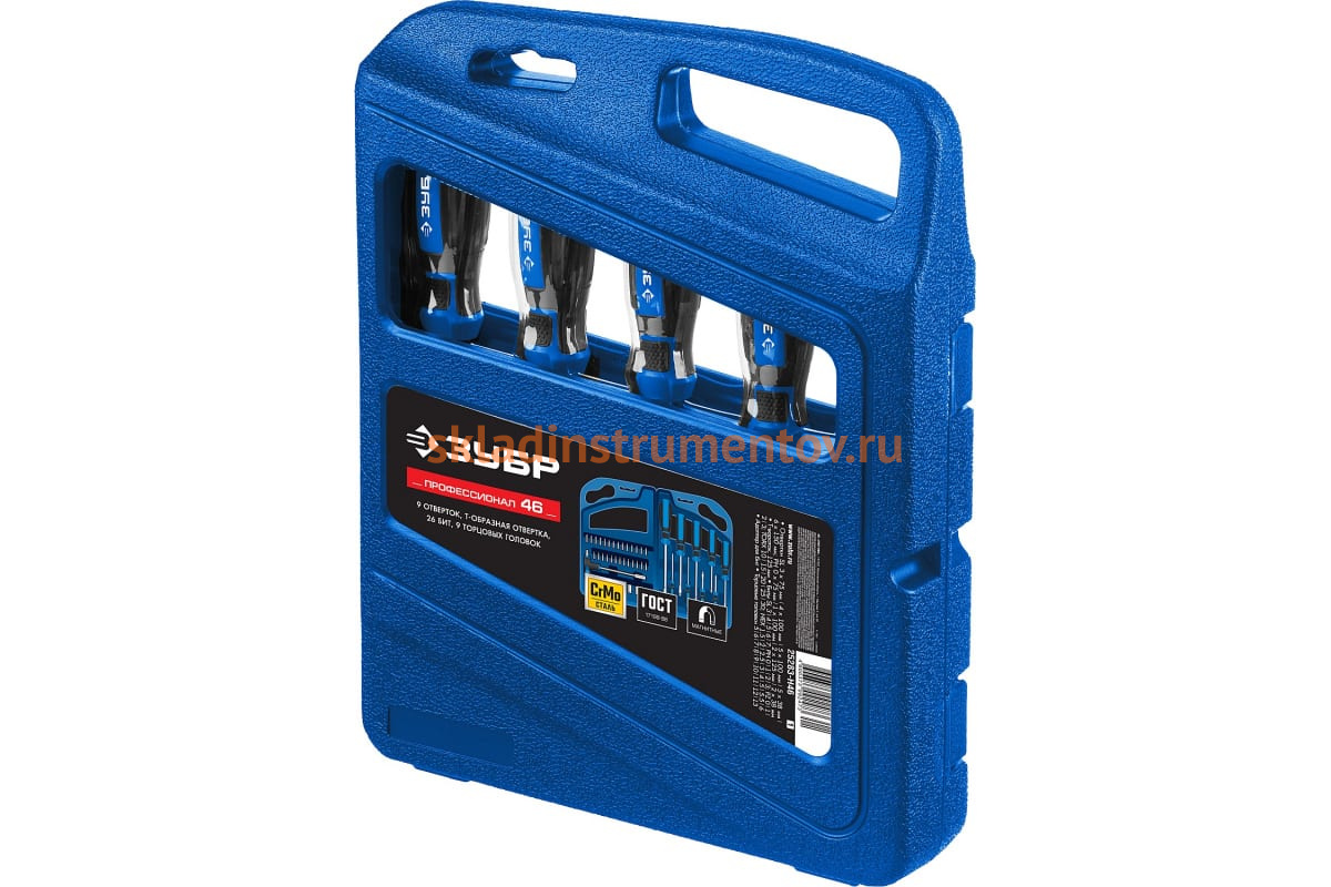 Набор отверток с насадками Зубр Профессионал-46 46 шт 25283-H46_z01 используется для установки и демонтажа крепежных элементов различного типа.