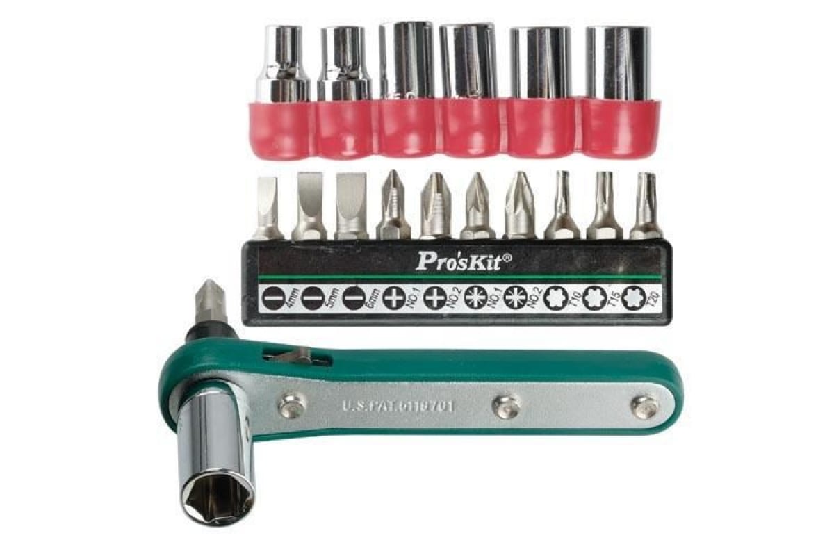 Ключ-отвертка с 17 насадками ProsKit 1PK-202A 00155551 включает в себя шесть торцевых головок и биты различного профиля. За счет этого инструмент оптимально подойдет для большей части крепежа.