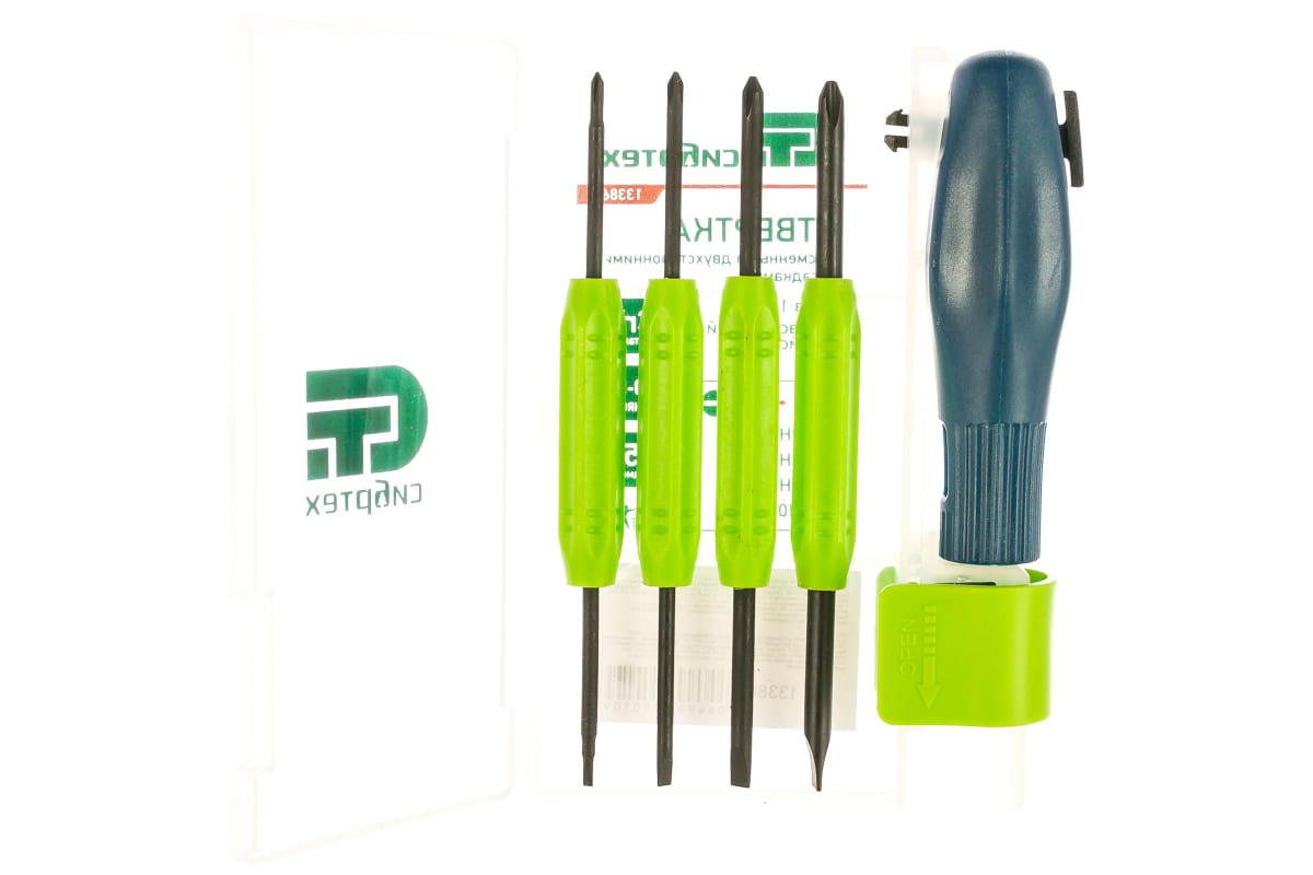Отвертка со сменными двухсторонними насадками, 8 в 1 СИБРТЕХ 13386 служит для монтажа или демонтажа крепежных соединений. Наконечники имеют твердость 50-56 HRC.