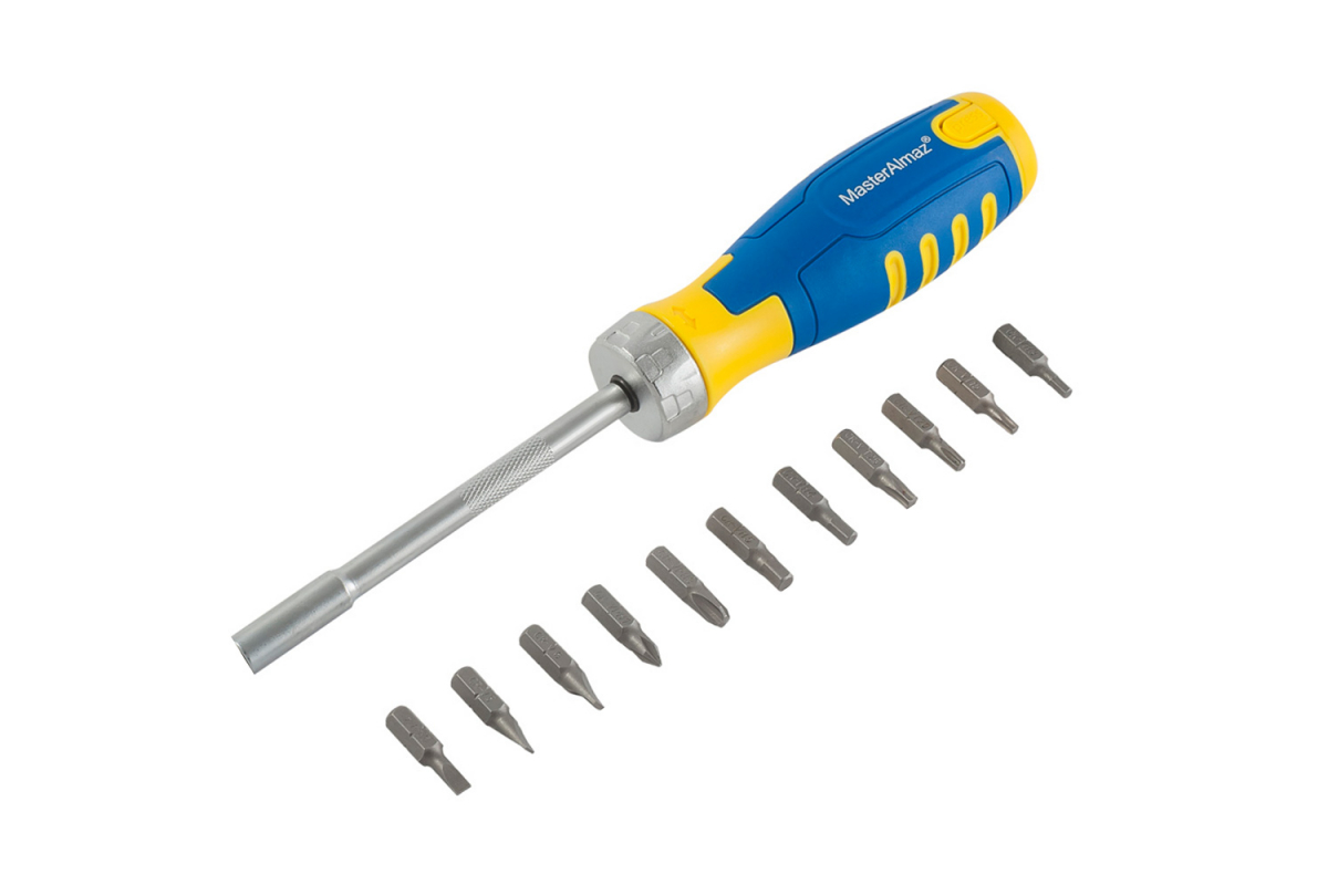Реверсивная отвертка с набором бит, 12 в 1 МастерАлмаз 10504026 подходит для использования в бытовых и профессиональных целях. Отличается простотой эксплуатации.