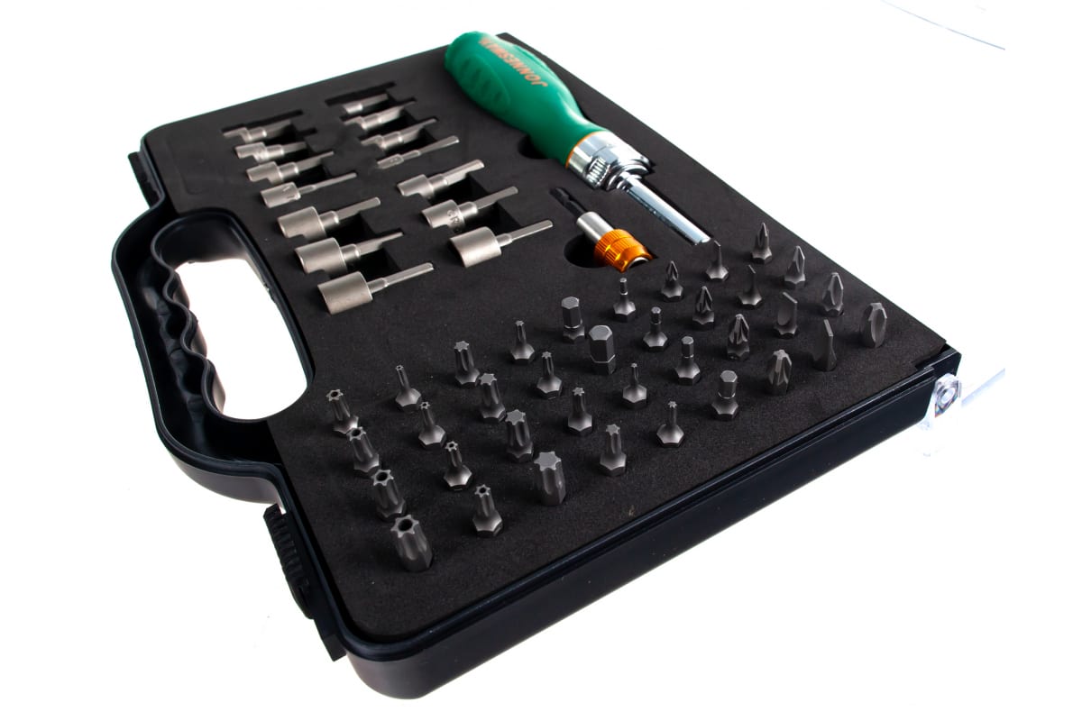 Трещоточная отверточная рукоятка с набором бит и насадок Jonnesway DR0152S может быть использована для различного рода слесарно-ремонтных работ. Инструмент изготовлен из качественного материала, что гарантирует его долговечность.