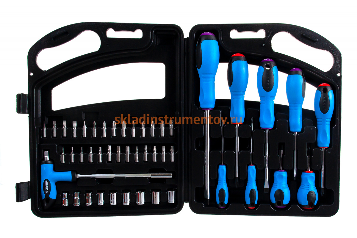 —Набор Зубр Эксперт Отвертка с насадками битодержатель с Т-образной ручкой 125 мм Hex 1/4"- SQ1/4" в пластиковом боксе 46 предметов 25283-H46