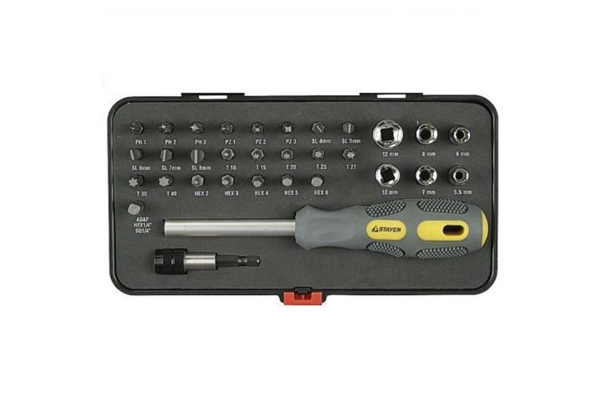 Отвертка MAX-GRIP в наборе с битами и торцевыми головками STAYER 25927-H32 G - это комплект из 32 предметов, предназначенный для монтажных и демонтажных работ. Насадки изготовлены из хромованадиевой стали, благодаря чему имеют долгий срок эксплуатации.