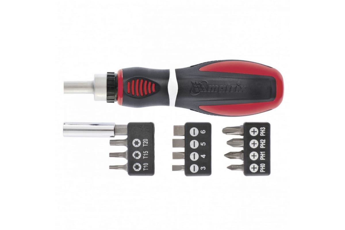 Реверсивная отвертка, набор бит 11 шт. CrV MASTER MATRIX 11546 используется для монтажа и демонтажа резьбовых соединений. Обладает реверсивным механизмом, что позволяет работать с крепежом не перехватывая руку. В комплекте идут одиннадцать сменных насадок с PH, Torx и SL профилями, которые изготовлены из хромванадиевой стали. Рукоять из двухкомпонентного нескользящего материала обеспечивает комфортное применение.