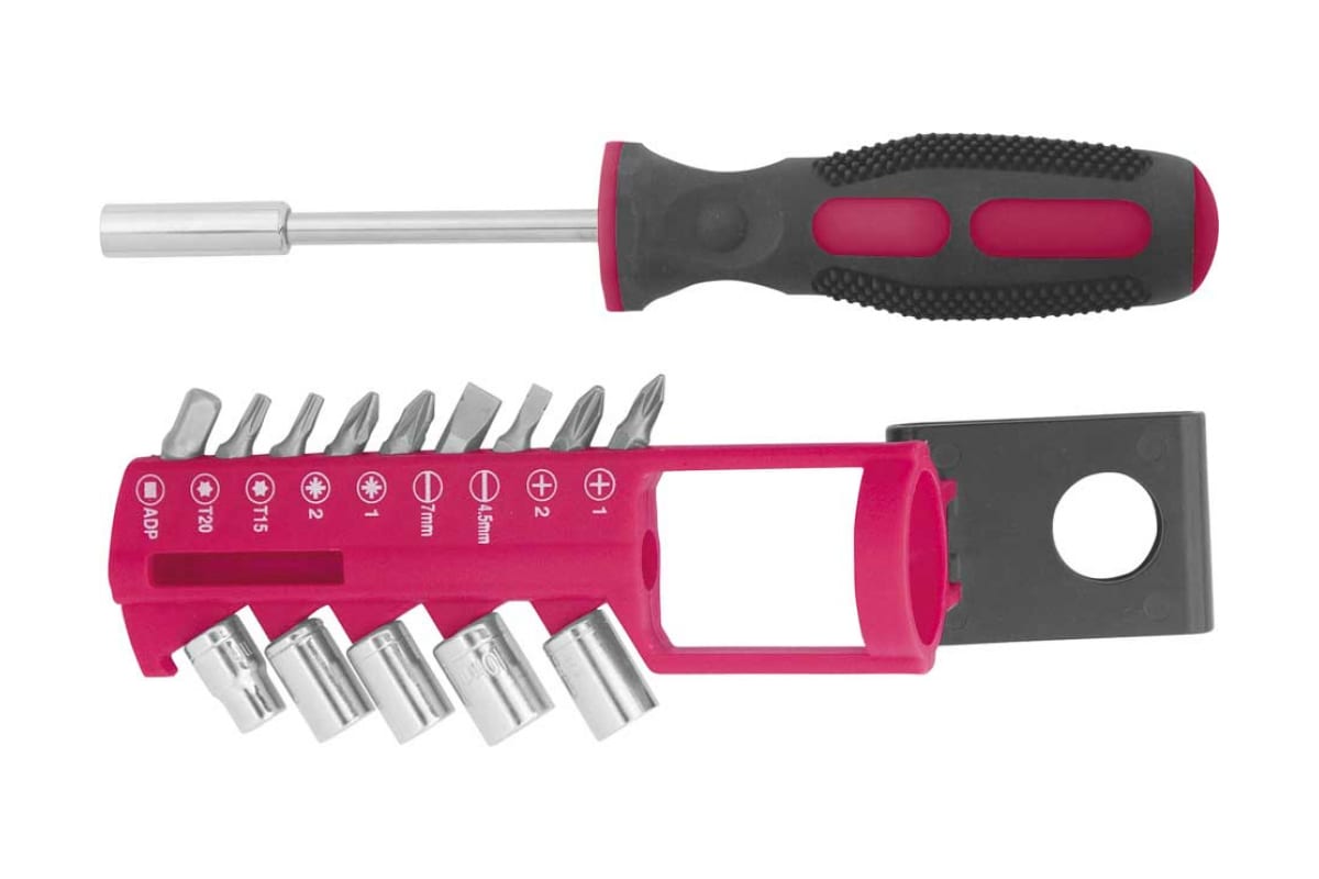 Отвертка с битами и головками 16 шт Контрфорс 126644 пригодится в строительных и бытовых целях. В комплект входят 13 насадок и адаптер для бит, что позволяет работать с различным крепежом. Благодаря пластиковому держателю обеспечено удобство их хранения. Отвертка оснащена магнитным держателем, что способствует надежному удержанию насадок.