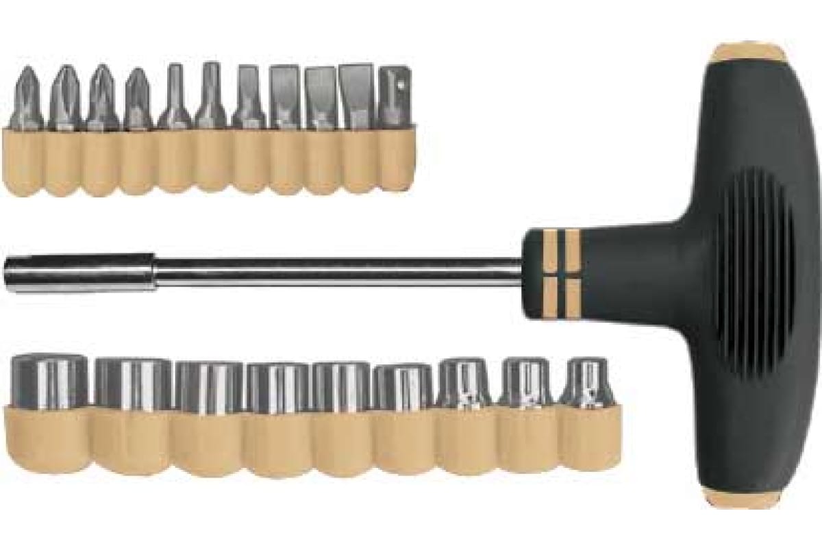 Т-образная отвертка, 11 бит и 9 торцевых головок Контрфорс 126623 является ручным инструментом для монтажа и демонтажа различного крепежа. Комплектуется битами с профилями SL, PH, PZ и торцевыми головками с разными размерами. Все насадки уложены в специальный держатель, что исключает их потерю. Благодаря Т-образной рукоятке увеличен крутящий момент.