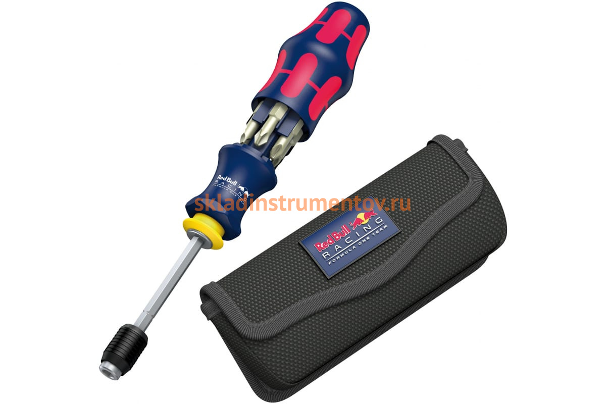 Ручка-держатель с выдвижным стержнем и быстрозажимным патроном WERA Kraftform WE-227702 - компактный, многофункциональный ручной иснтурмент с 6 насадками из нержавеющей стали в ручке. Представленный набор обеспечивает одновременное использование в обоих режимах работы - ручном и машинном. Все комплектующие поставляются в удобном чехле Red Bull Racing.