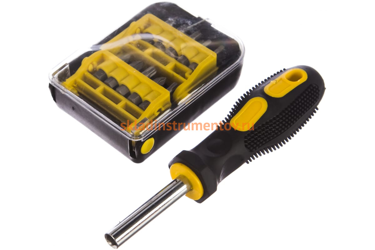 Набор: отвертка-битхолдер с магнитом, 2-компонентная рукоятка, биты Сr-V, в боксе, 21шт STAYER STANDARD 25078-H21 используется в области ремонтно-монтажных работ для отвинчивания/завинчивания крепежа с плоским, крестовым, звездообразным или шестигранными рабочим профилем.