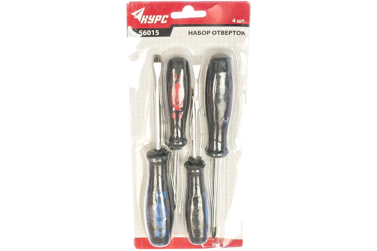 Отвертки 4 шт. CrV КУРС Стандарт 56015 состоит из четырех отверток, с наконечниками типа SL и PH. Они имеют жало, изготовленное из хромованадиевой стали, и удобную прорезиненной рукоятку. Каждая отвертка обладает намагниченным наконечником, для более удобной работы при демонтаже различных креплений.
