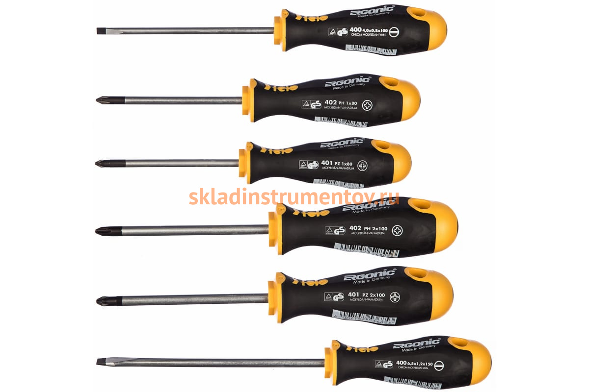 Набор отверток 6 шт в упаковке Felo Ergonic 40096118 - комплект включает отвертки с тремя типами шлицев для обслуживания резьбовых соединений: SL, PZ, PH. Все изделия отличаются повышенной износоустойчивостью и легко выдерживают существенные нагрузки. Стержни отверток изготовлены из прочной хром-молибден-ванадиевой стали. Рукоятки имеют эргономичную форму, удобно ложатся в руку, благодаря технологии ERGONIC, и не скользят.