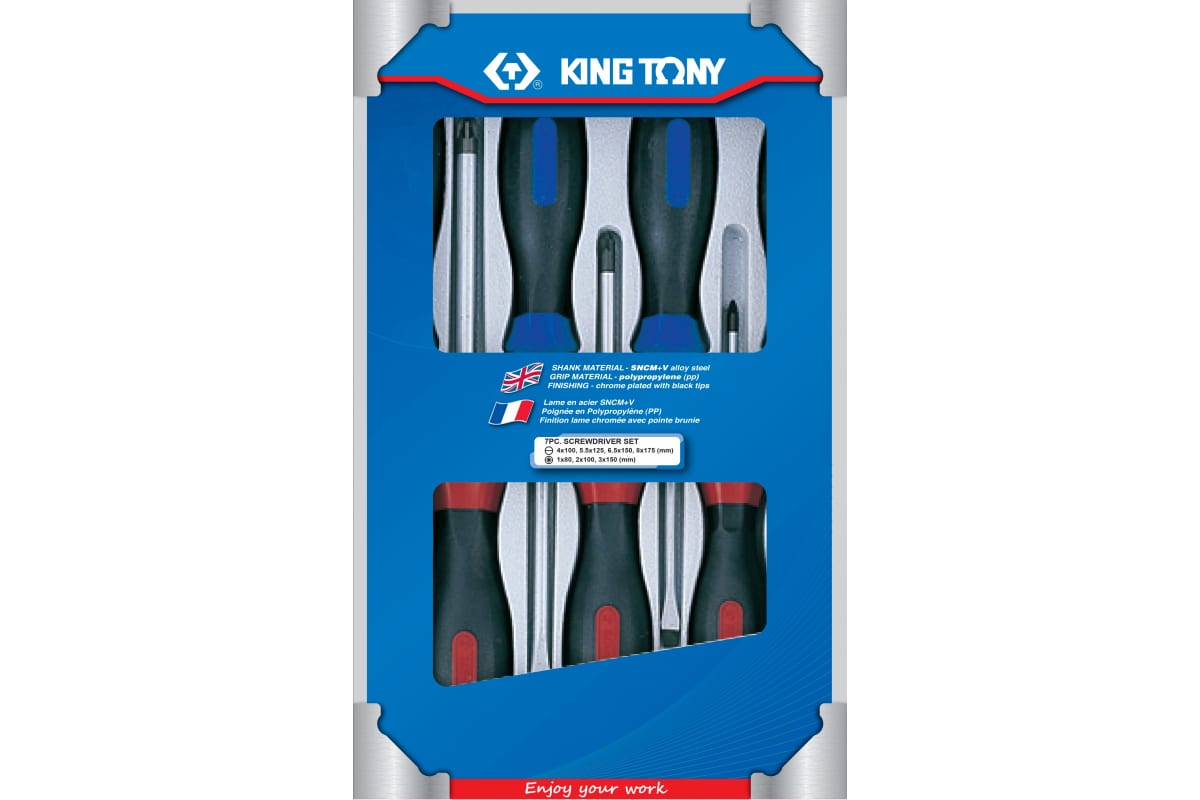 Набор отверток в коробке 7шт KING TONY 30127MR применяется для сборочных и ремонтных работ в быту и профдеятельности. В набор входит 4 плоские РН и 3 крестовые отвертки PZ самых популярных типоразмеров и длин. Изделия оснащены эргономичными рукоятками и прочными стальными стержнями. Отвертки не подвержены появлению коррозии и прослужат долгий срок.