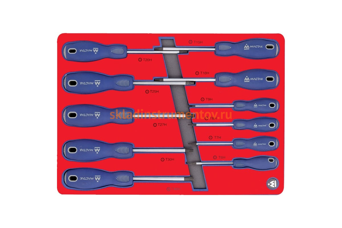 Набор отвёрток TORX, ложемент, 11шт МАСТАК 5-4411 предназначен для укомплектовывания инструментальной тележки на рабочем месте мастера в слесарной мастерской, на производственном участке и т. д. В наборе представлены отвертки со звездообразными наконечниками TORX разных размеров. Каждый компонент оснащен эргономичной ручкой из двухкомпонентного материала. Изделия расположены в удобных отдельных ячейках ложемента из EVA материала.