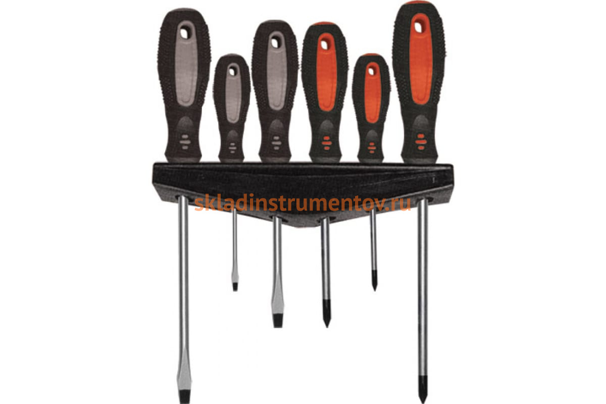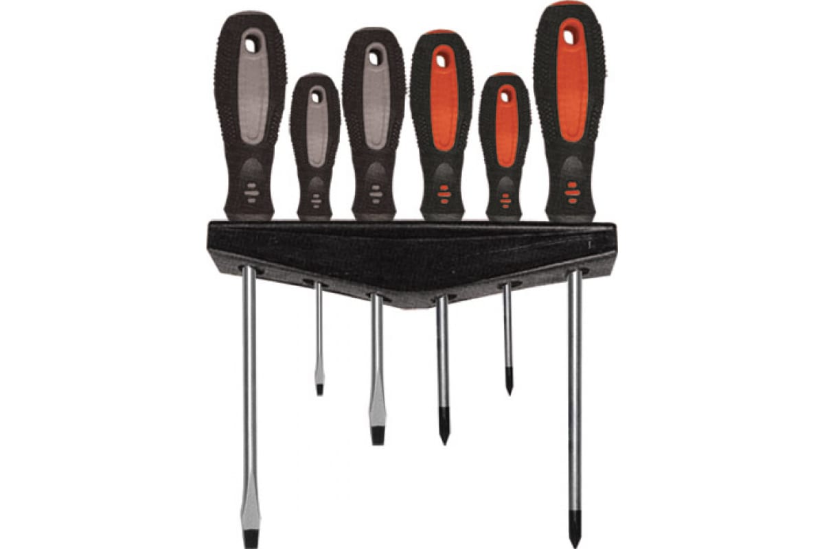 Набор отверток КУРС 6шт. 55986 включает в себя 3 отвертки со шлицем PH и 3 отвертки со шлицем SL. Они выполнены из хромованадиевой стали, что гарантирует долгий срок службы. Двухкомпонентные рукоятки обеспечивают крепкий захват в руке и предотвращают соскальзывания. На конце рукояток есть специальное отверстие, которое позволяет хранить инструменты в подвешенном состоянии.