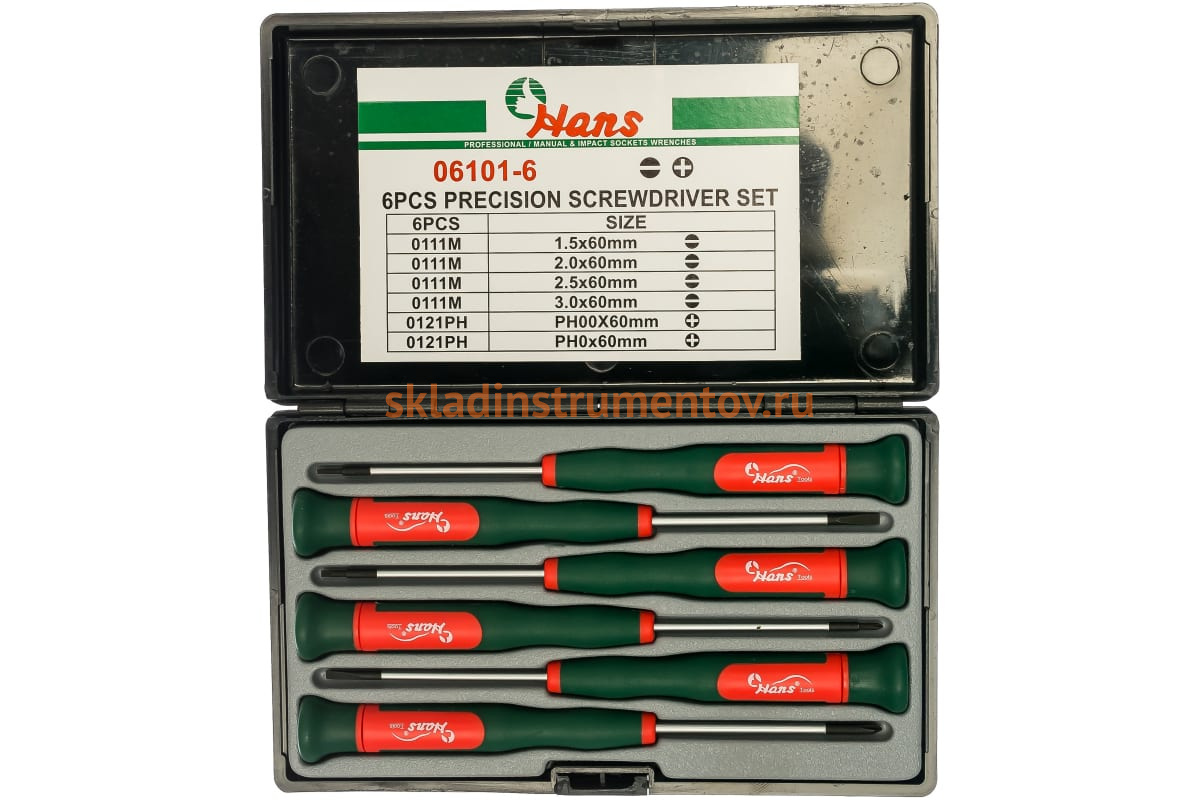 Набор отверток для точной механики Hans 06101-6 используется при ремонте различной техники, например, телефона, фотоаппарата, плеера,а также точной механики. Стержни инструментов изготовлены из стали, стойкой к возникновению коррозии. Удобные рукоятки выполнены из двухкомпонентного материала. Комплект поставляется в пластиковом кейсе.