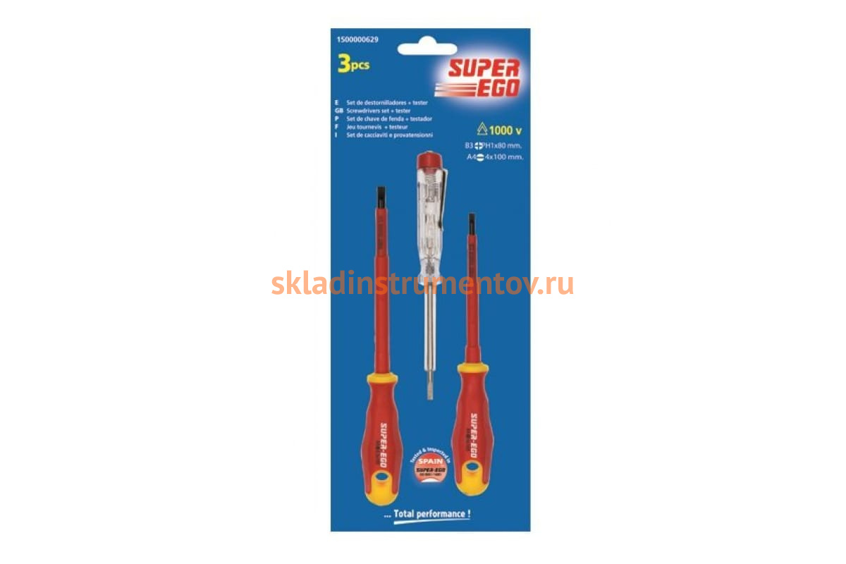 Набор диэлектрических отверток до 1000V с тестером, 2шт SUPER-EGO 1500000629 состоит из плоской и крестовой отверток, а также контактного тестера напряжения.