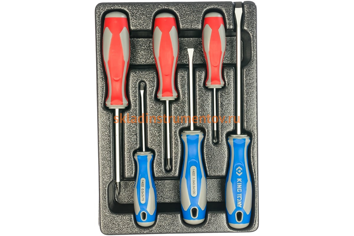 Набор отверток (ложемент, 6 предметов) KING TONY 9-31106MR - профессиональный инструмент для вворачивания и извлечения крепежных элементов с плоским и крестоообразным шлицем. Двухкомпонентные рукояти не скользят в руках и отличаются удобством эксплуатации. Стержни отверток прошли термическую обработку, которая гарантирует им стойкость к износу и образованию сколов.