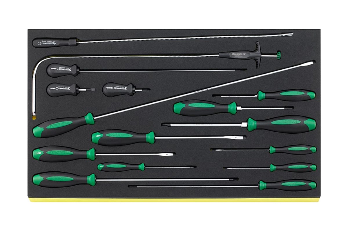 Набор отверток Stahlwille 96832098 предназначен для монтажа и демонтажа резьбового крепежа. Изготовлен из устойчивой к деформации и износу легированной стали, что обеспечивает длительный срок эксплуатации. Для защиты от коррозии нанесено хромовое покрытие. Набор поставляется во вкладыше TCS. Двухкомпонентные рукоятки гарантируют надежный хват, за счет чего работа становится удобной и безопасной.