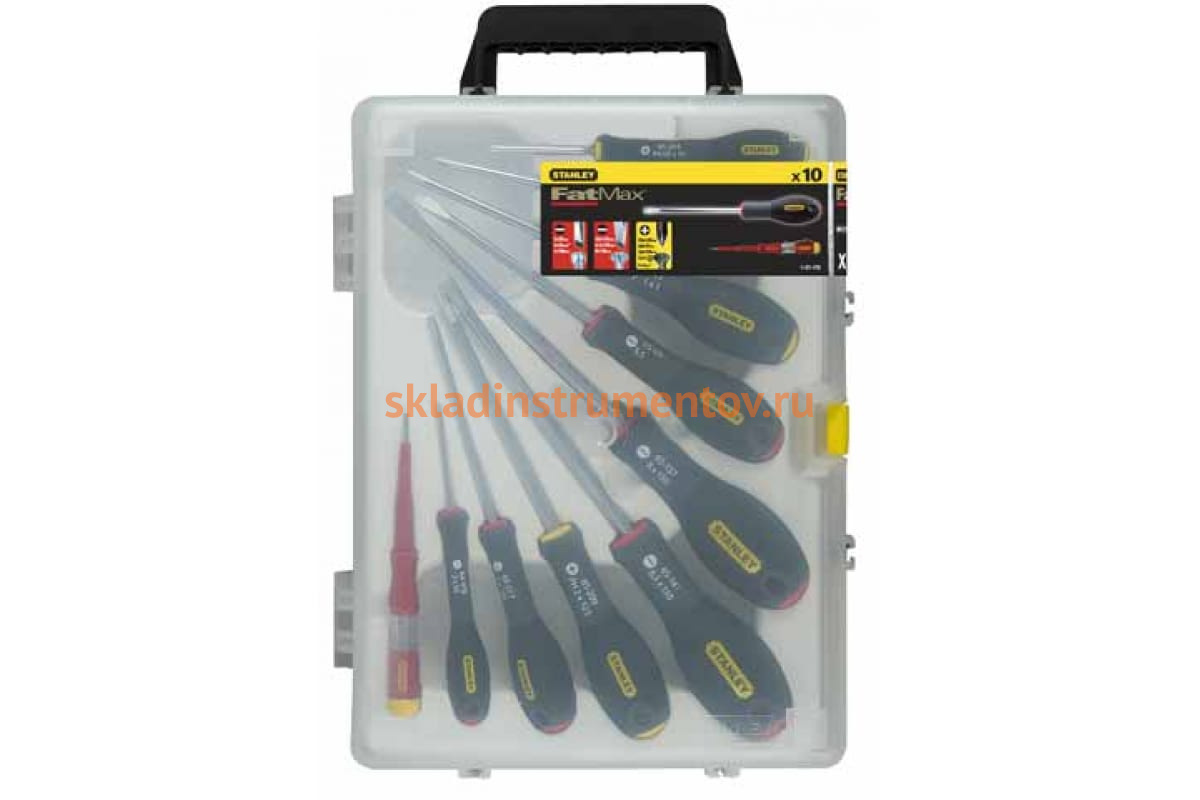 Набор отверток FATMAX Stanley 0-65-439 состоит из десяти отверток, имеющих прямой и крестовой рабочий профиль. Благодаря наличию отвертки-тестера можно проверить, находится ли под электрическим напряжением то или иное резьбовое соединение. Стержни отверток выполнены из хромованадиевой стали. Набор поставляется в удобном кейсе с прозрачной крышкой и ручкой.