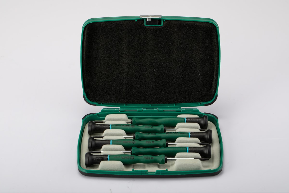 Набор отверток для высокоточных работ, форма звездочка torx, 6шт Sata 09313 широко используется для выполнения крепежных операций с применением специальных винтов с внутренним профилем TORX. Данный комплект станет прекрасным помощником для профессиональных ремонтников в области точной механики. Для удобства хранения и транспортировки набора предусмотрен надежный, закрывающийся футляр.