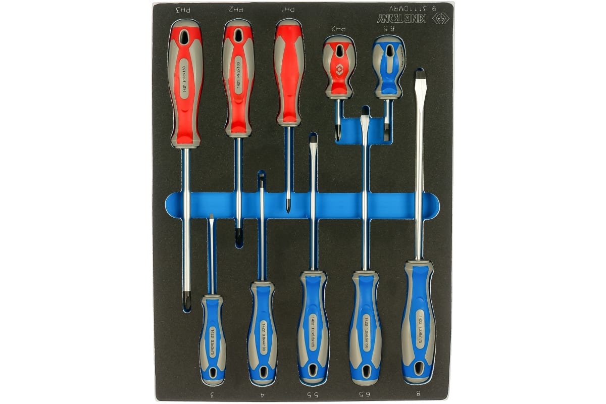 Набор отверток (ложемент, 10 предметов) KING TONY 9-31110MRV отличается устойчивостью к сколам благодаря термической обработке рабочих поверхностей. Сфера применения инструментов - установка, затягивание и демонтаж крепежных узлов. Ручки из пластика и резины не скользят в руках и не проводят электрический ток.