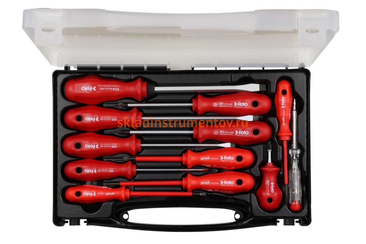 Набор отверток SL/PZ/PH, ударная отвертка, отвертка SL/PH VDE, отвертка тестер сети в кейсе, 12 Felo 20011496 представлен в расширенной комплектации и предназначен для обслуживания резьбовых соединений. В том числе подходит для работ под напряжением до 1000 В.