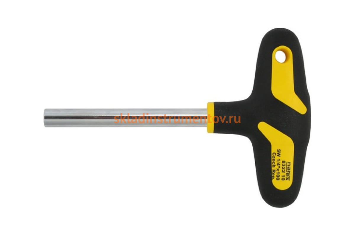 Отвертка для бит NAREX S Line Profi 832210 имеет удобную Т-образную форму ручки, материалом для изготовления которой служит сочетание твердого полипропилена и мягкого термопластичного эластомера. Рабочая часть инструмента изготовлена из прочной высоколегированной стали с антикоррозийным хромовым покрытием. Наконечник изделия представлен в виде внутреннего шестигранника 1/4" для вставки бит. Диаметр стержня равен 10 мм, длина - 90 мм. Рукоятка имеет размеры 100х50 мм. Данная модель отвертки обеспечивает высокий крутящий момент.