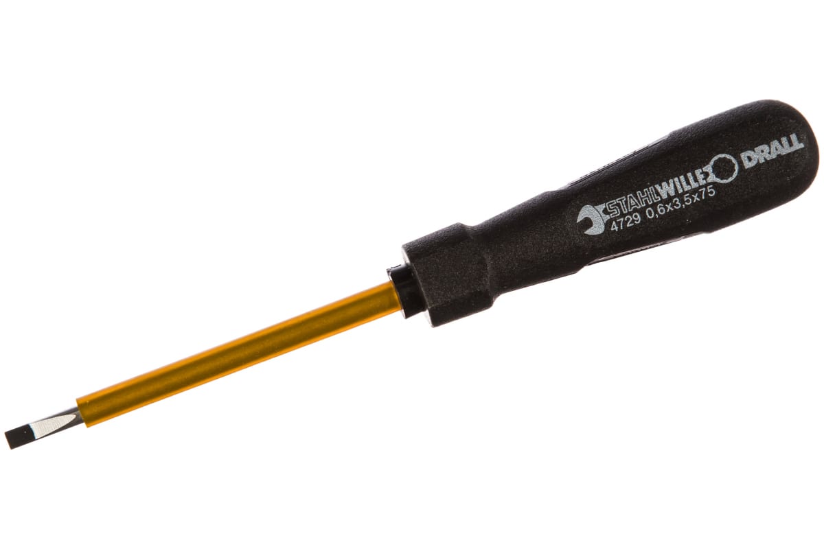Шлицевая отвертка STAHLWILLE 4729 2 0,6X3,5X75 47291035 предназначена для монтажа и демонтажа винтов с прямым шлицем. Стержень из прочной стали имеет оплетку. Жало оснащено матовым покрытием. Эргономичная пластиковая рукоятка не скользит в руке во время работы.