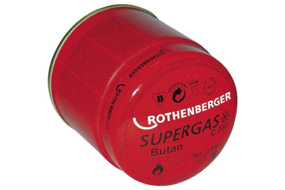 Газовый баллончик Rothenberger SUPERGAS C200 35901-В используется с устройством для пайки ROFLAME PIEZO 1800 С. Заправлен бутаном, содержит долю пропана. Соответствует мировым стандартам EN 417. Баллон разрешено использовать при низких температурах.