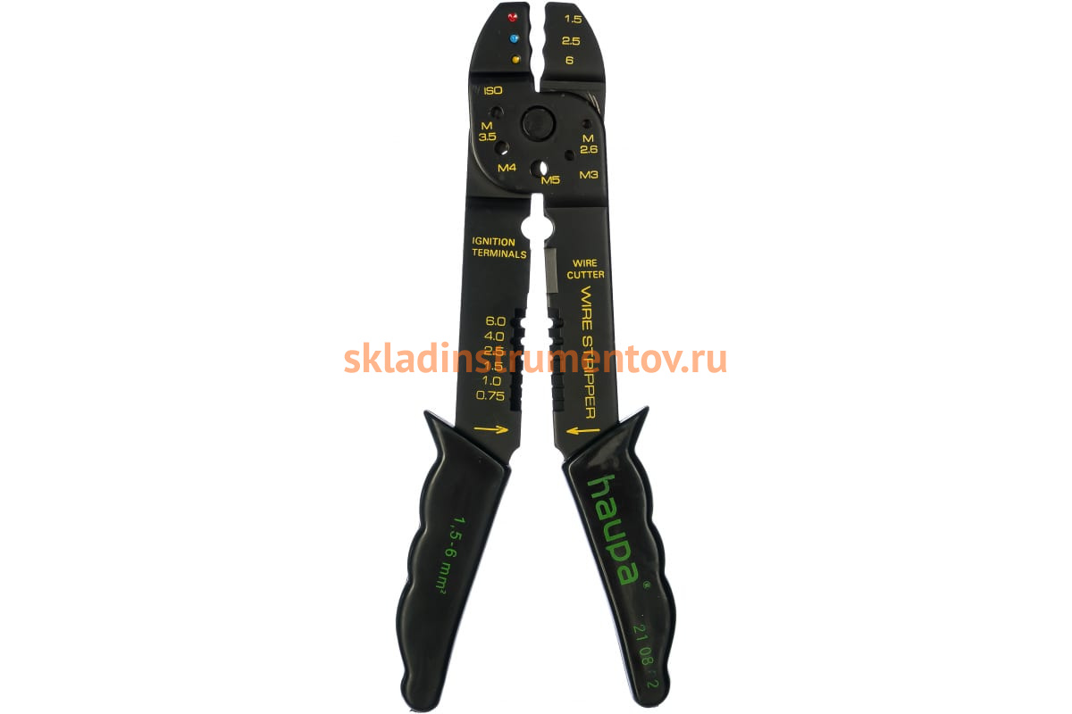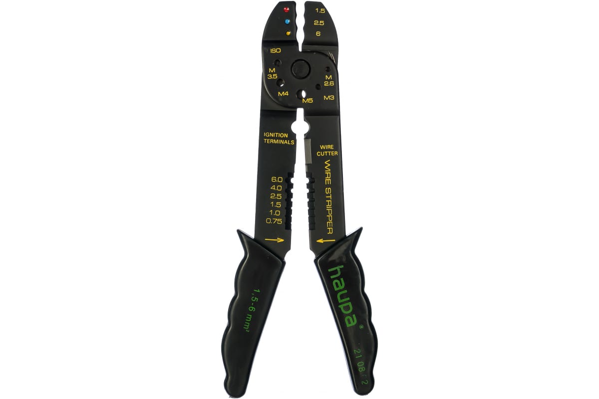 Универсальный обжимной инструмент для сжимающих кабельных наконечников HAUPA 210802 - многофункциональный ручной инструмент для резки проводов, тонкой проволоки и болтов, зачистки изоляции и опрессовки изолированных наконечников овальной формы. Приспособление отличается простой и удобством в эксплуатации. Захватные части оснащены эргономичными чехлами-накладками.