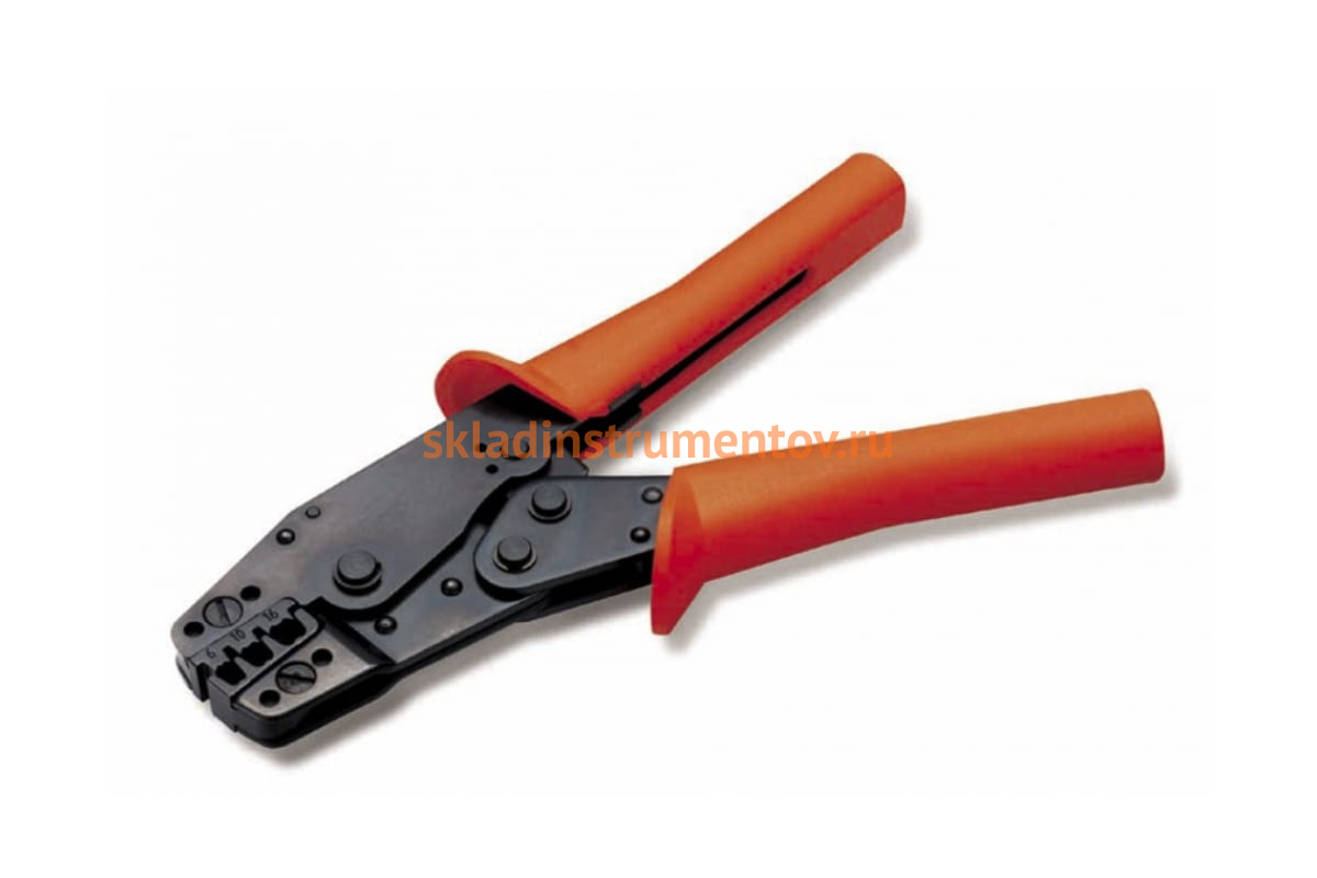 Клещи CIMCO 10 1946 изготовлены для трапециевого опрессования втулковых наконечников с сечениями 6-16 кв.мм. Оборудованы трещоточным механизмом.