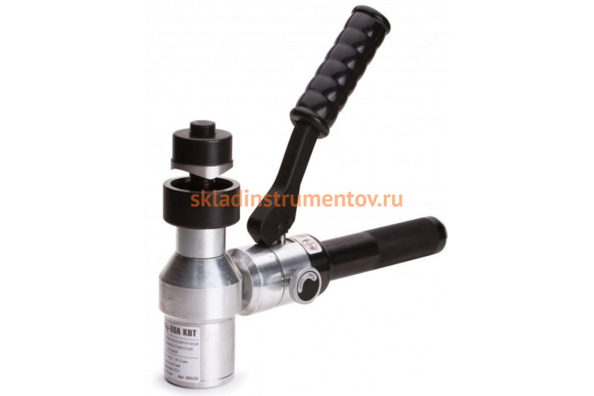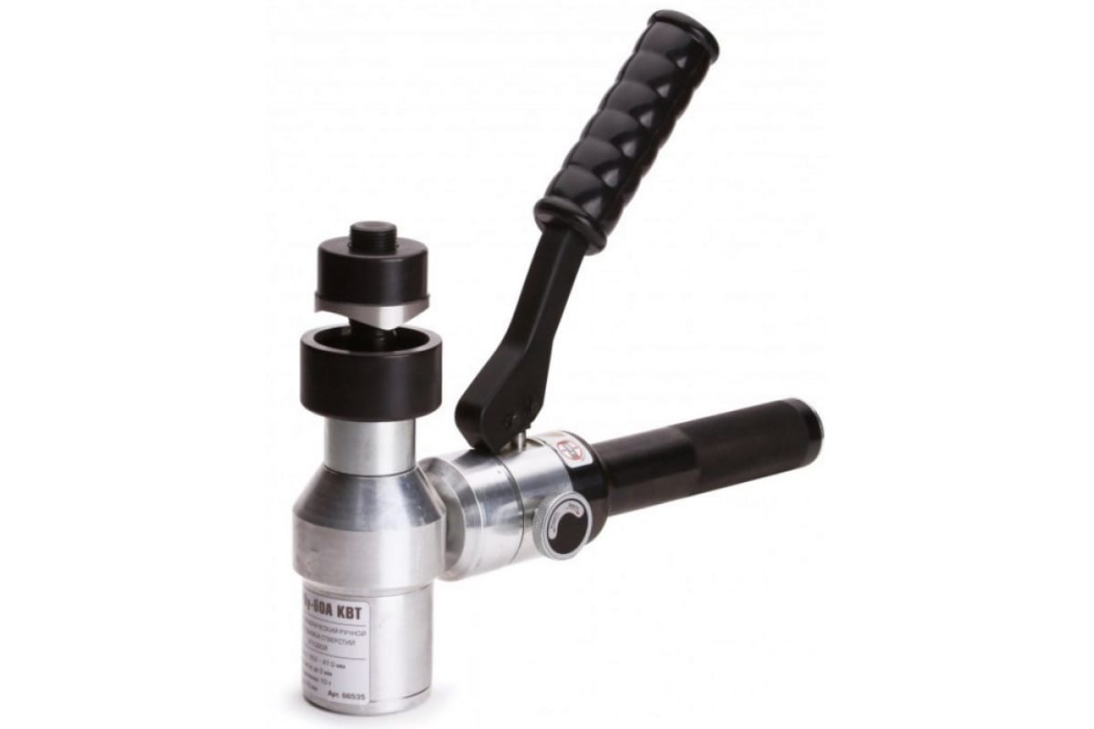 Гидравлический ручной угловой пресс для пробивки отверстий КВТ ПГРОу-60А 66535 оснащается рабочей головой с функцией поворота на 360 градусов. В качестве оснастки используются перфоформы (матрица+пуансон) 8 вариантов размера, которые позволяют пробивать отверстия диаметром 16.2, 18.6, 20.5, 22.5, 25.4, 28.3, 37 или 47 мм. Корпус агрегата выполнен из жесткого и прочного материала - алюминиевого сплава.