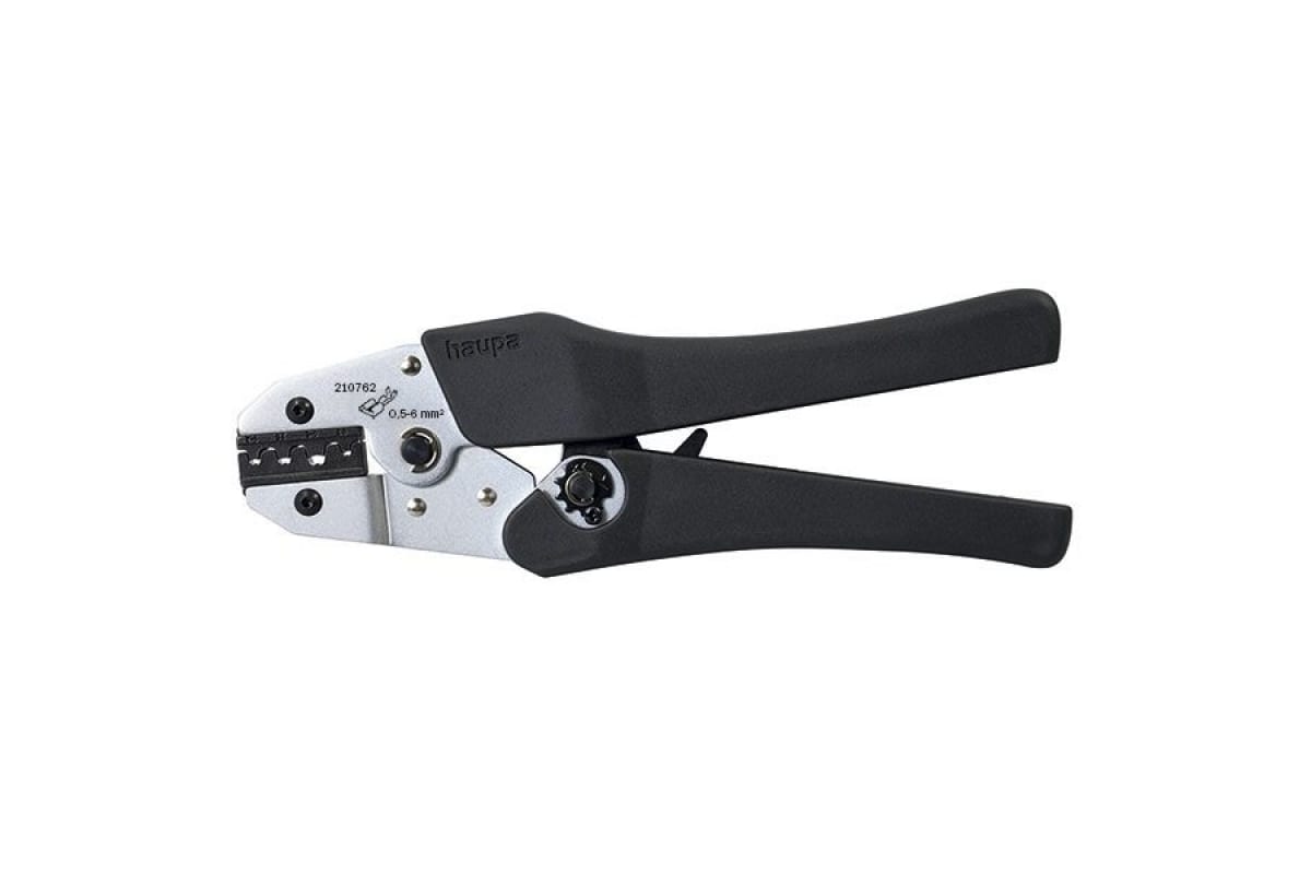 Обжимной инструмент HAUPA 210762/E представляет собой ручные пресс-клещи для работы с открытыми неизолированными кабельными наконечниками из латуни сечением от 0.5 мм2 до 6.0 мм2. Обжимник очень прост и удобен в применении, имеет надежную конструкцию и эргономичные пластиковые ручки.