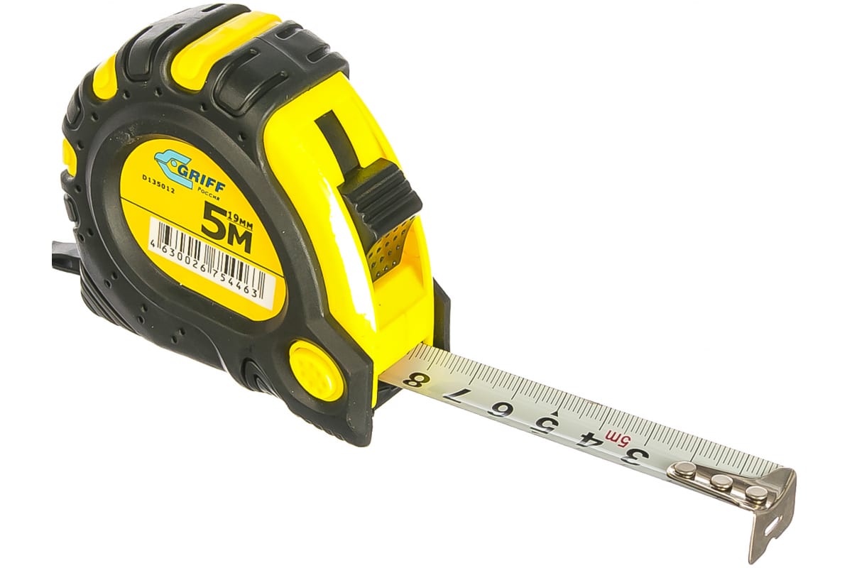 Рулетка 5мх19мм с 3 фиксаторами, в обрезиненном корпусе GRIFF d135012 используется для эффективных измерений с точностью в несколько миллиметров.
