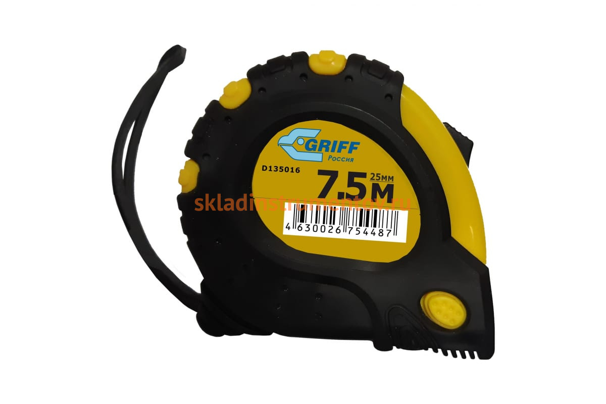 Рулетка 7.5мх25мм с 3 фиксаторами, в обрезиненном корпусе GRIFF d135016 используется на производстве и строительных площадках.