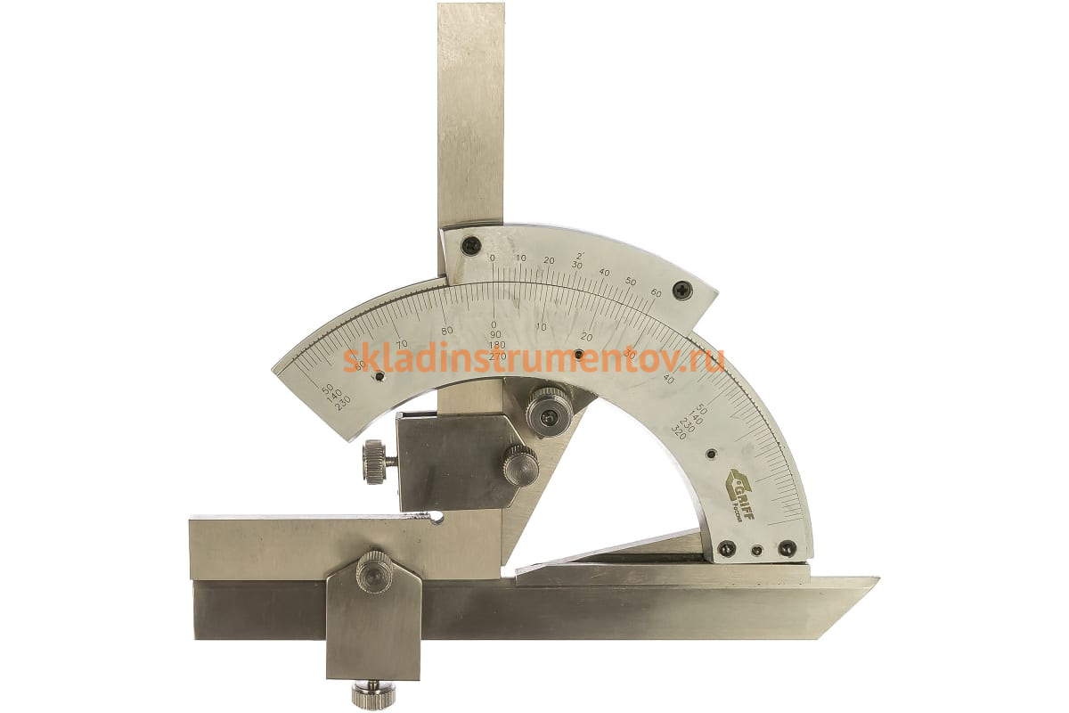 Угломер типа 2-2 GRIFF ГОСТ 5378-88 D142001 служит для измерения углов изделий. Внутренние углы определяются в диапазоне 40-150º, внешние - 0-320º. Цена деления шкалы - 1º. Для повышения точности замеров в данной модели предусмотрен нониус с величиной отсчета 2'.