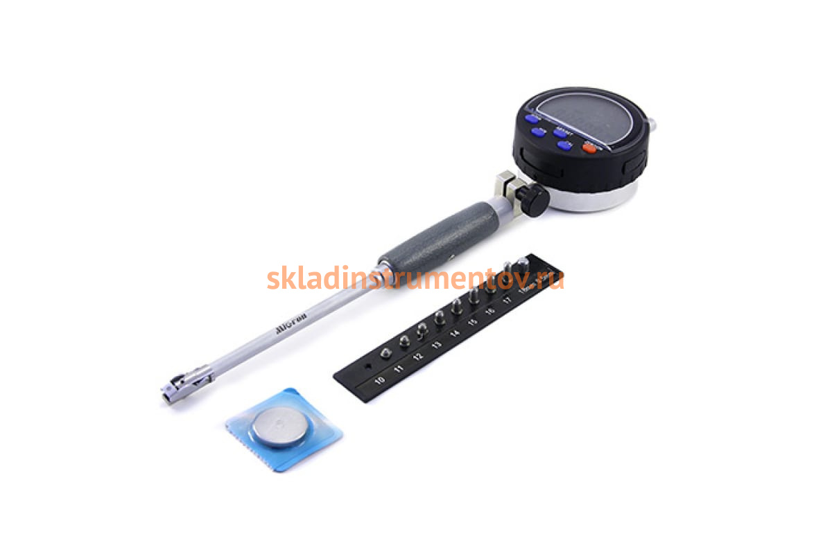 Корпус нутромера защищен теплоизолирующей втулкой. Благодаря сменным вставкам, доступен диапазон измерений 10-18 мм. Инструмент снабжен центрирующим мостиком для совмещения линии измерения с осевой плоскостью отверстия .