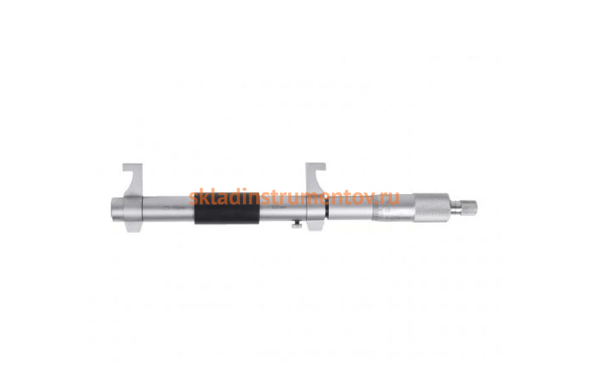 Измерительные губки располагаются сбоку: на одном конце прибора неподвижная, на другом - двигающаяся. Доступен диапазон измерений 125-150 мм. Показания снимаются по всей длине отверстия со шкал стебля и барабана.