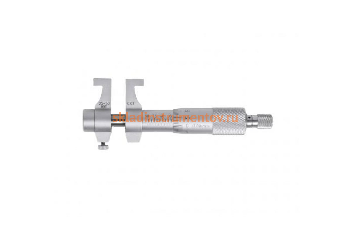 Измерительные губки располагаются сбоку: на одном конце прибора неподвижная, на другом - двигающаяся. Доступен диапазон измерений 25-50 мм. Показания снимаются по всей длине отверстия со шкал стебля и барабана.