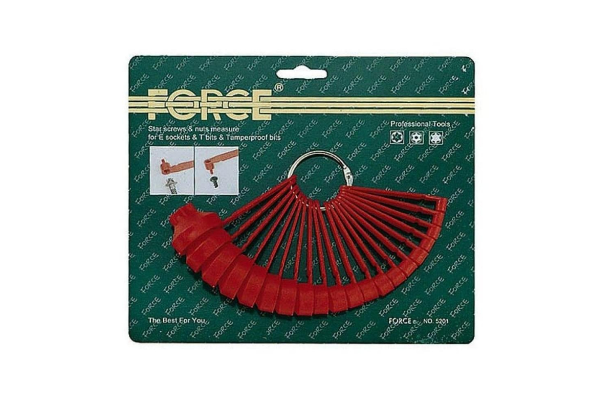 Набор для измерения размеров звёздочек FORCE 5201 представляет собой комплект шаблонов, которые можно использовать для определения внешних и внутренних шлицов в виде 6 лучевых звездочек.